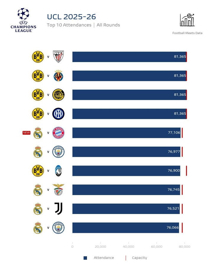本赛季欧冠上座人数前十: