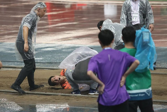 在最后一跳中,跳板上的积水让石雨豪脚后跟打滑,在落地时失去重心,重重地摔进了沙坑。