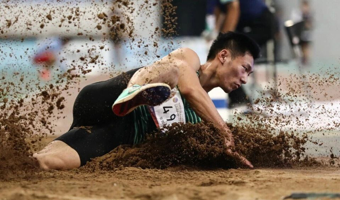 他稳步起跑,逐渐加速,在起跳板前纵身一跃,随后稳稳落在沙池中。