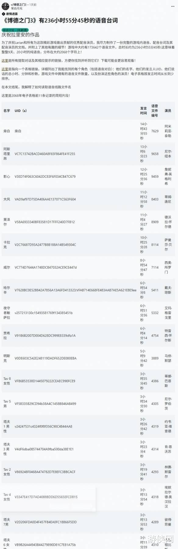 根据提取的数据,游戏中一共有173642个语音文件,涉及大约2068个角色。玩家还详细统计了每个角色的配音时长、台词数量以及配音演员。