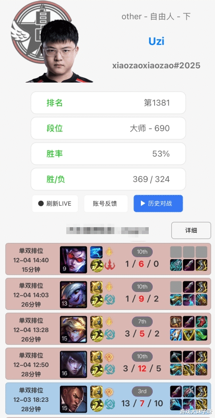 Uzi复出彻底无望,排位遭遇4连败后4天没登录,被戒网瘾了,Uzi复出这件事,几乎已经成了LPL转会期“永不落幕的悬念”,每年赛季交替,只要Uzi稍微动动鼠标、登上韩服打一把Rank,立刻就会引发玩家群体集体狂欢般的误读——“他回来了!”、“下赛季RNG将重组!”、“Uzi要再冲一次S赛!”……这种情绪甚至远超实际逻辑。